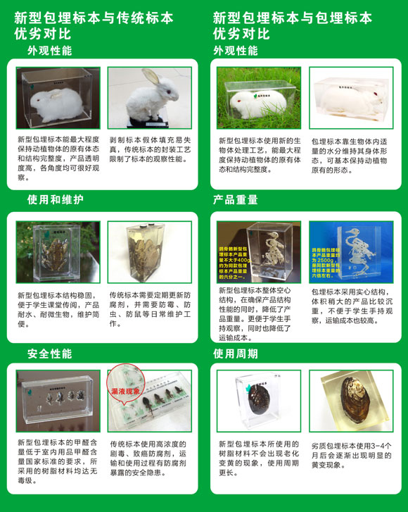 新型包埋標本的特點 ◆輕盈便攜、透明直觀:產(chǎn)品為空心結構,輕便易觀察。 ◆安全環(huán)保、自然真實:使用包埋材料和封裝材料環(huán)保安全。先進的動植物干燥處理工藝,不破壞動植物的原有的整體結構,更完整,更逼真。 ◆長久保存、性價比高:高分子材料滲透包裹處理,更經(jīng)久耐用?招慕Y構降低產(chǎn)品的重量,性價比更高。 |
